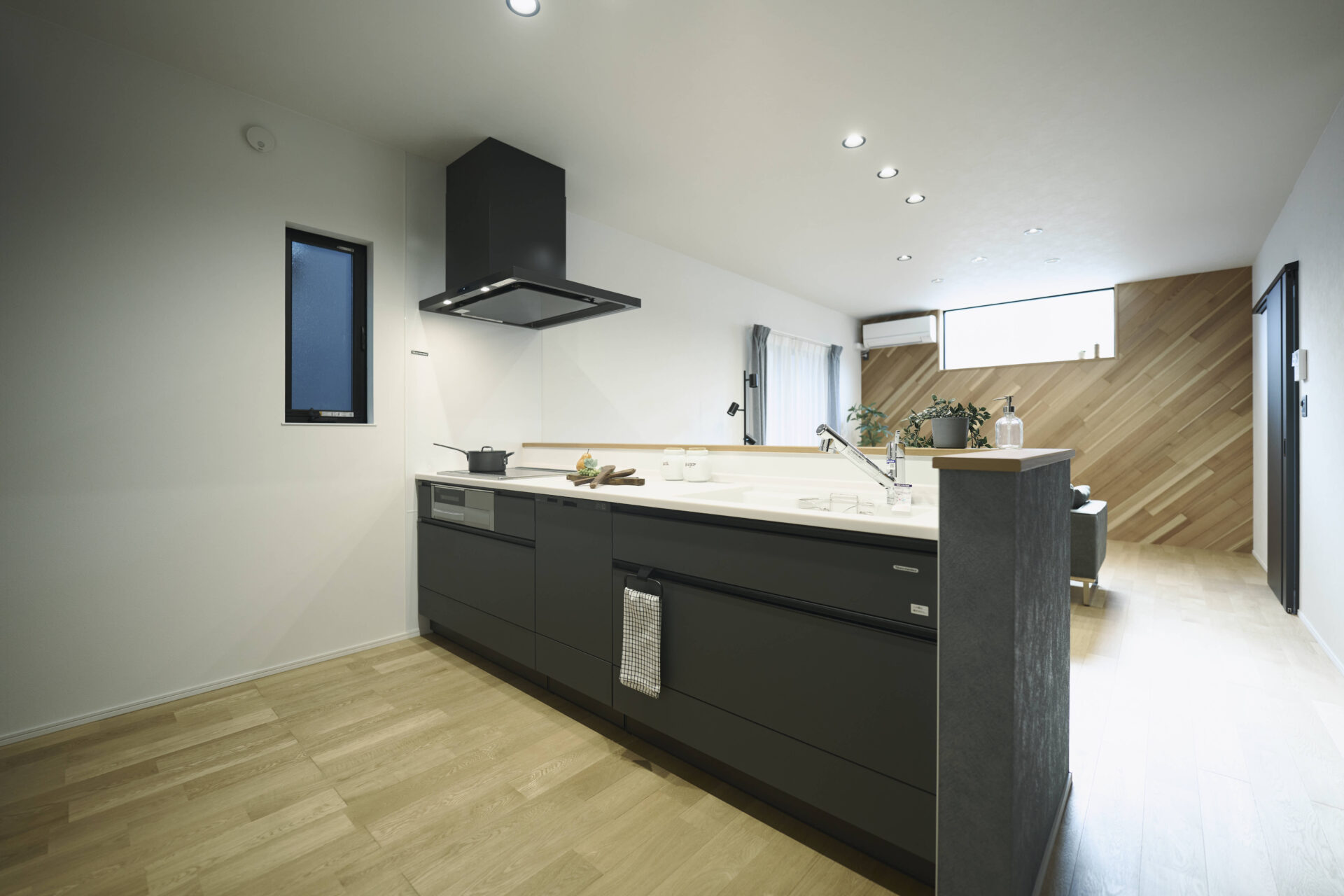 キッチン|キッチンからLDを見渡せる事で、空間としての繋がりを。