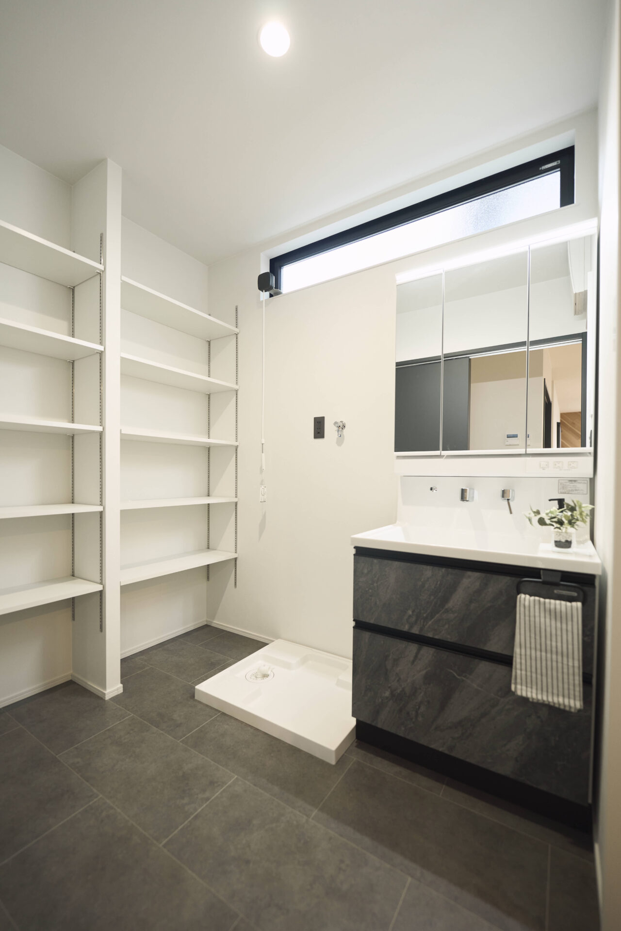 洗面所|3面鏡収納や引出収納を完備。カウンターは人工大理石を採用し、耐候性や耐熱性、耐汚染性に優れキレイな状態を保ちます。