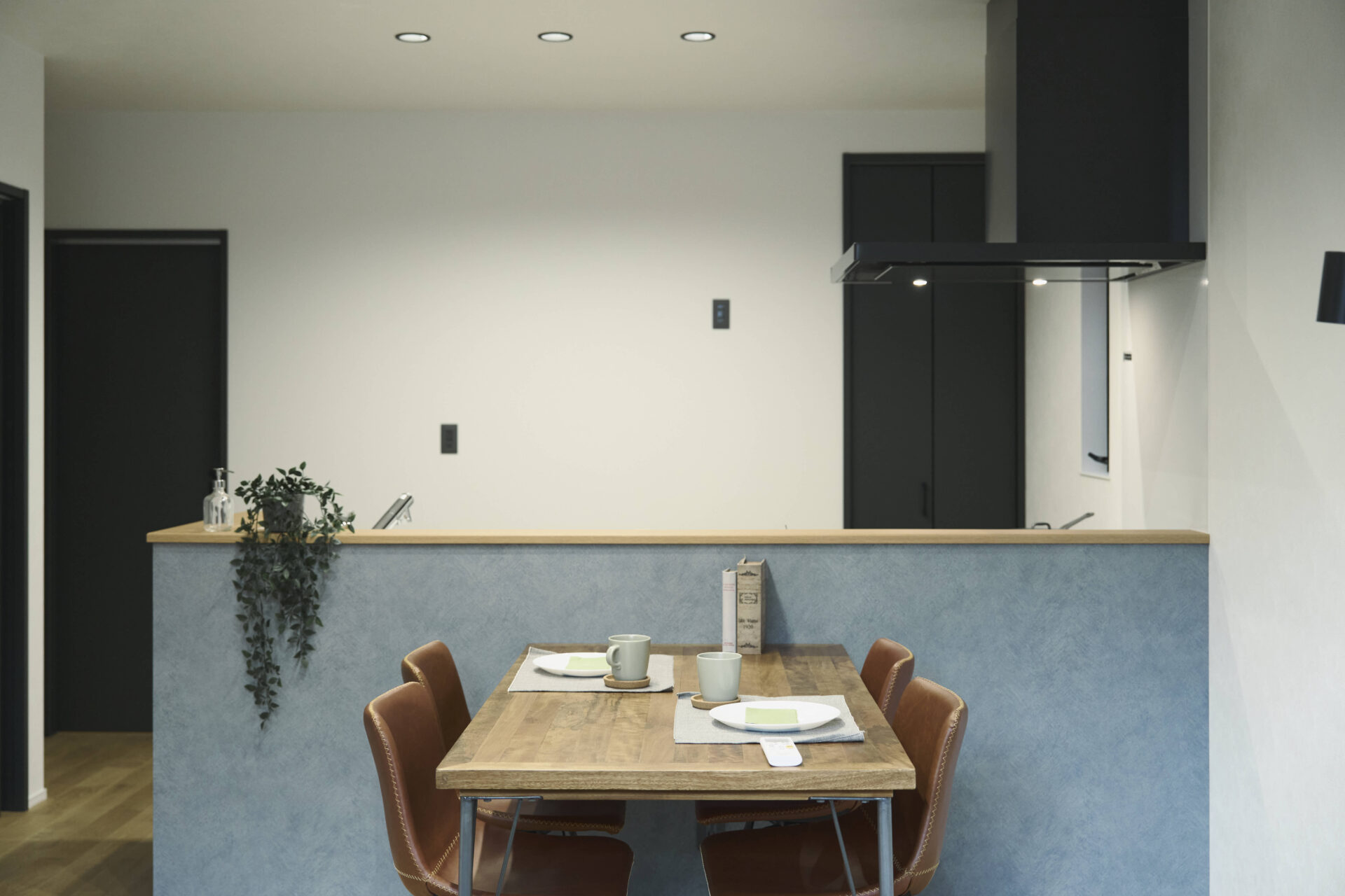 キッチン|オープンではあるものの、少し壁を立ち上げ手元は隠せるように。コンロ奥の扉は1.5畳のキッチンパントリー。